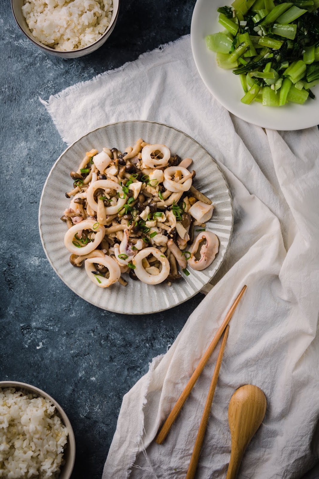 在鍋中放入鴨油、蒜末以及鹹蛋黃用中小火炒到起泡泡,倒入透抽轉大火拌炒至半熟,再將鴻禧菇與鹹蛋白放入拌炒,撒少許白胡椒調味一下,盛盤後撒上蔥花,完成。