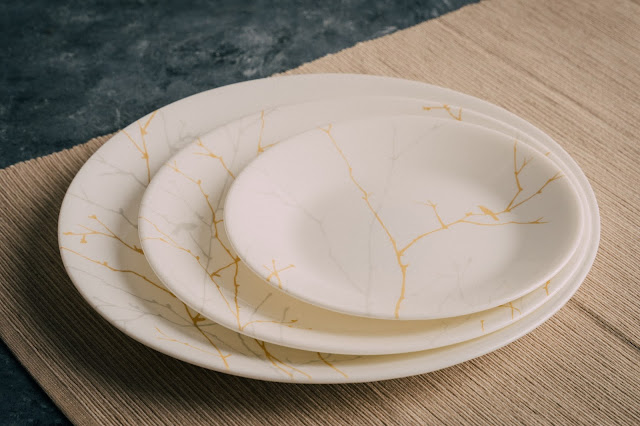 冬日詩篇餐盤組,太太利用三個不同大小的餐盤來設計一份豐富的早午餐,首先六吋平盤裝上秋冬時令的水果葡萄柚,在秋冬之際帶上橘紅色,看起來溫暖又活潑,八吋的平盤,鋪上生菜,但不裝滿,可以露出外圍漂亮的樹幹圖騰,再放上小番茄以及金桔片,擠上一點金桔汁,顏色漂亮也好吃,最後主食的十吋平盤放上現煎的鬆餅,撒上象徵冬日雪花的糖粉,也為口味帶來一抹甜,這三樣的組合色彩豐富也吃得飽,感謝先生一直以來的照顧。