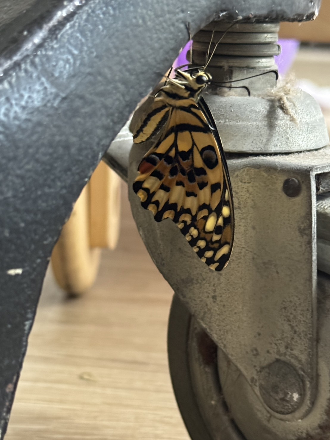 後來這第二批剩下的四隻就拿進室內養,不然他們會被天敵吃掉,之前有看到很像虎頭蜂的蜂飛來金桔盆栽,我在想可能在找食物(毛毛蟲)吃吧,然後飛來就算了,牠還會爬在葉子上到處找,感覺真的很容易會被找到吃掉,也因為看到這樣加上十隻變四隻,只要有看到毛毛蟲就會拿進來養直到變蝴蝶~能救一隻是一隻。